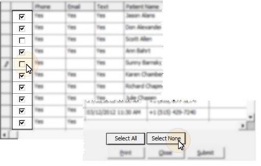 checkbox beside each patient to indicate whether you want that patient to receive the message. You can also use the Select All and Select None tools to choose the patients to include.