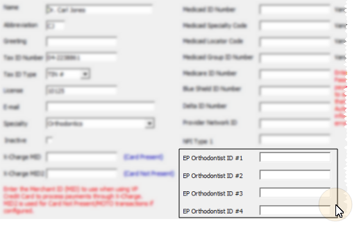 Enter orthodontist identification data - Open your orthodontist table, and enter the identification data into the EP fields of each doctor's record. (See "Set Up Orthodontist Records" for details.)