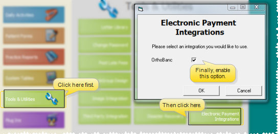 Activate ViewPoint electronic payment integration - From the ViewPoint main menu, go to Tools & Utilities, then Electronic Payment Integrations. Enable the OrthoBanc option, then click Ok to exit.