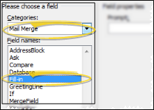 - Select Mail Merge in the Category box, and choose the Fill-In field name option. Click Ok to accept your choice, and Ok again to accept a blank prompt and insert the code into your document. If you do not see the merge code, or if you see an error, press Alt+F9 to toggle the merge code display. (If you wish, consult your Word documentation for details about setting up other "switches" for this type of code.)