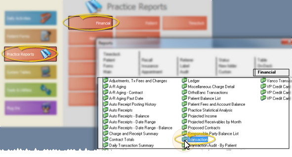 Security issues - The security rights are different when you access the Transaction report from the Daily Activities menu as opposed to the Practice Reports menu. This provides a way for staff that