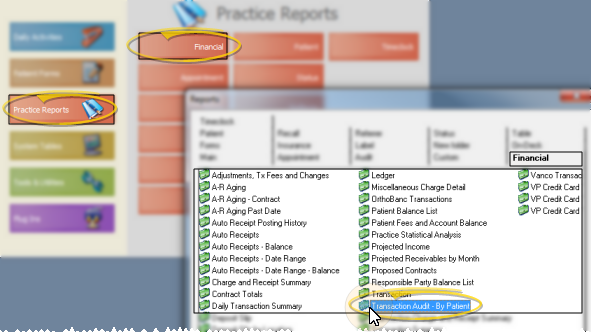 ViewPoint main menu > Practice Reports > Financial > Transaction Audit - By Patient.