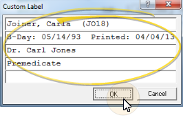 Edit the label text fields as needed, and click Ok to continue. Although the label auto-fills with information from the patient folder, you can edit any of the text before printing the label. Your customized text is used for this print job only.