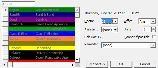 Auto-events - Respond to Auto-Events triggered by to the appointment event, including whether or not to post charges, print letters, define treatment dates, and change the patient's status. See "Set Up Procedure List" for details about setting up Auto-Events.