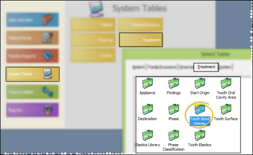 ViewPoint main menu > System Tables > Treatment > Tooth Bond Names.