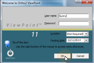 Location - As you log into ViewPoint, you may select your office location. Any receipts you post will be credited to that office, regardless of the office assigned to the patient folder. If you do not select a location as you log in, receipts you post are credited to the patient's home office. In addition, receipts are always posted to the orthodontist currently assigned to the patient folder.