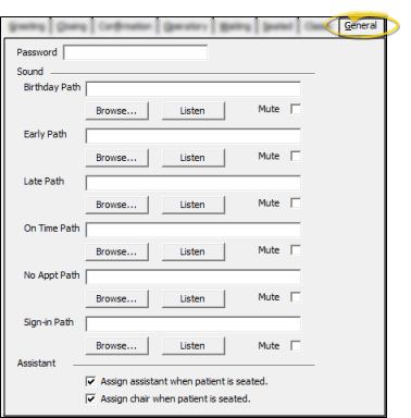 Use the General tab of your On-Deck Properties window to set up your sign-in password, choose sounds to play when certain patient sign-in events occur, and determine whether assistants and chairs can be assigned when a patient is seated. These settings are workstation-specific: Other workstations in your ViewPoint system may have different settings.